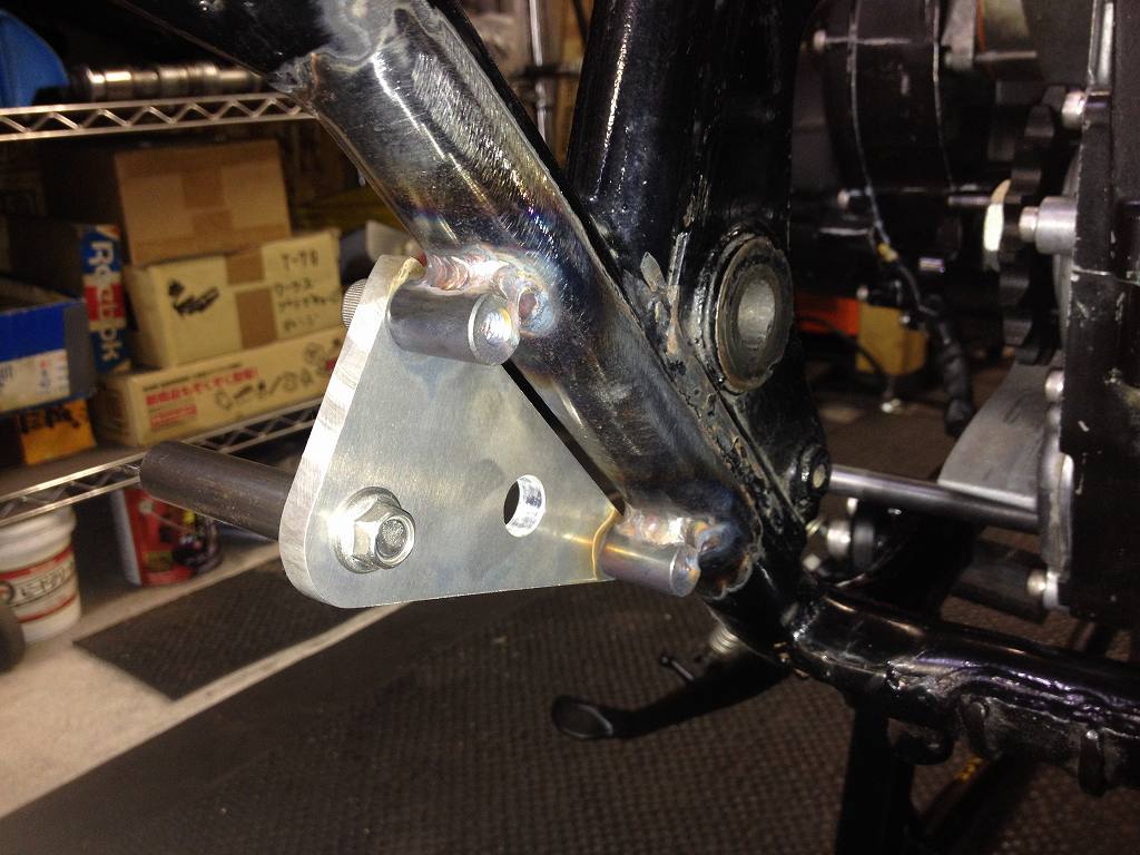 Z1000J2 F.K様 ワークスバックステップ取り付け その2 Z1000J2 F.K様 2021.05.25 2015.07.30 バックステップ用のボスを4ヵ所溶接で取り付けます。 ・ 下側などは、寝板に寝ころんで仰向けで溶接します。 強度が必要なので全周溶接です。 ・ 溶接したら筆で塗装します。 ・ 仮組みして跨ってみて剛性を確認します。 ・ ペダルはこの後製作します。 リヤフェンダーは現在開発中当社オリジナルのFRP製品です。